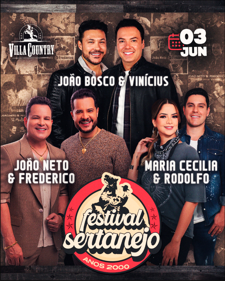 João Bosco & Vinícius, João Neto & Frederico e Maria Cecília & Rodolfo se encontram no palco do Villa Country, no dia 3 de junho, para celebrar a era universitária, que revolucionou o sertanejo nos anos 2000
